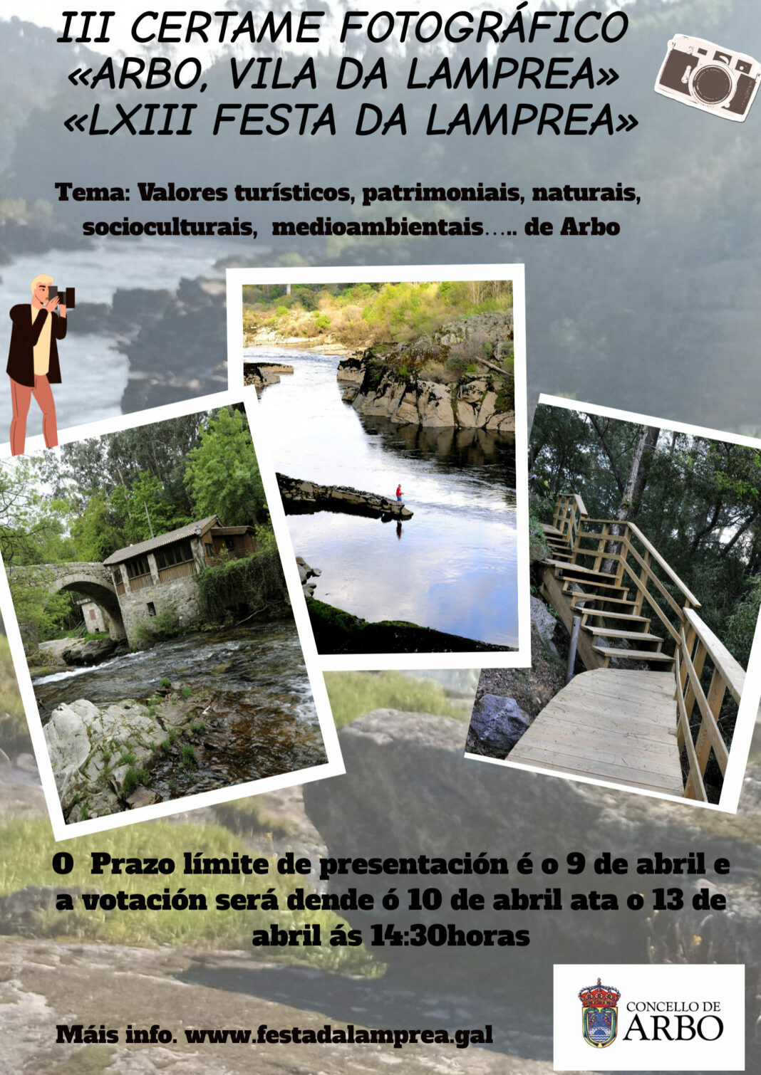 • O Concello de Arbo convoca a terceira edición do certame de fotografía “Arbo Vila dá Lamprea “LXIII Festa dá Lamprea”, para dar a coñecer os recursos turísticos que este municipio pode ofrecer, así como a Festa da Lamprea, declarada de interese turístico nacional no ano 2016, que este ano esta prevista para os días 28, 29 e 30 de abril de 2023.