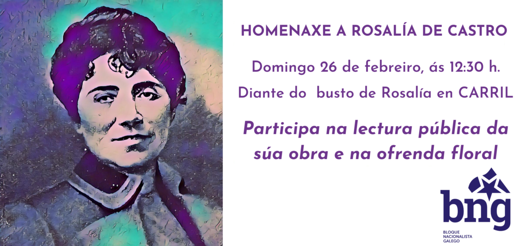 Por estos motivos, e para homenaxear a súa figura, o BNG de Vilagarcía anima á cidadanía a participar na lectura pública da súa obra e na ofrenda floral a partir das 12:30 h. diante do busto de Rosalía en Carril .