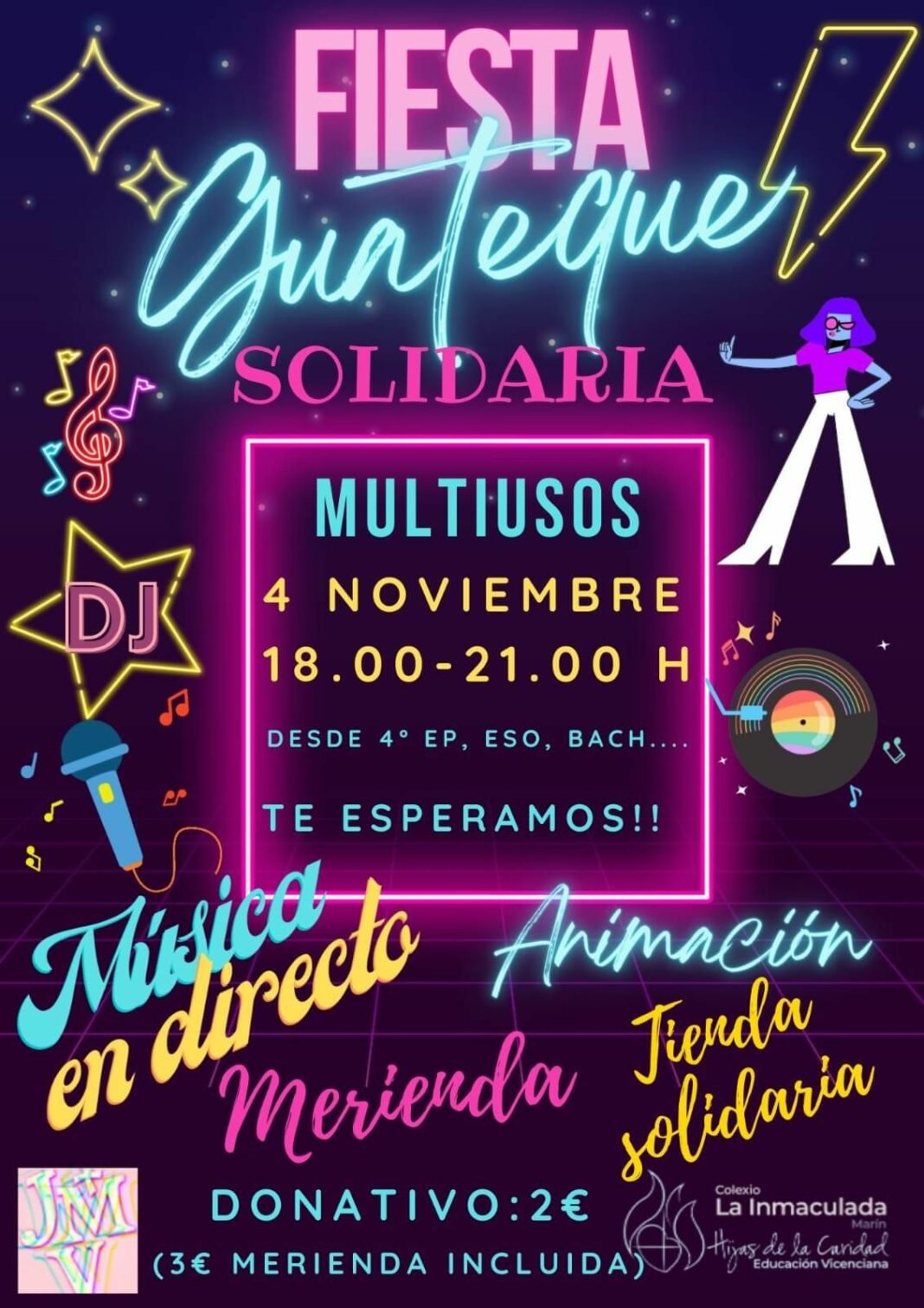 O vindeiro venres 4 de novembro, de 18.00h a 21.00h no Multiusos de Marín, a asociación JMV (Juventudes Marianas Vicencianas) do Colexio La Inmaculada organiza unha Festa Solidaria dirixida á rapazada de Marín desde 4º de Primaria e animan a participar aos maiores de ESO e Bacharelato, xa que ademais de contar con DJ, están previstas actuacións musicais en directo dirixidas especialmente a eles. Será unha xornada diferente de música, baile, obradoiros…