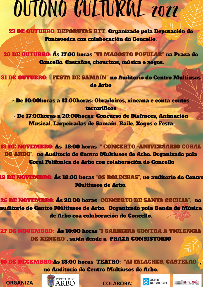 O 31 DE OUTUBRO: a FESTA DE SAMAÍN no Auditorio do Centro Multiusos de Arbo será a actividade terrorífica do outono: pola maña de 10:00horas a 13:00horas: Obradoiros, xincana e conta contos terroríficos e de 17:00horas a 20:00horas: Concurso de Disfraces, Animación Musical, Larpeiradas de Samaín, Baile, Xogos e Festa. As incripcións para participar nos obradoiros da maña se farán nas oficinas municipais do Concello de Arbo. O 19 DE NOVEMBRO o auditorio do Centro Multiusos acolle ás 18:00 horas “OS BOLECHAS” e no marco do programa de dinamización lingüística FalaRedes 2022 da Secretaría Xeral de Política Lingüística para a Rede de Dinamización Lingüística (RDL), No marco do programa de dinamización lingüística FalaRedes 2022 da Secretaría Xeral de Política Lingüística para a Rede de Dinamización Lingüística (RDL), o 10 DE DECEMBRO ás 18:00 horas teremos a obra de TEATRO: “AÍ FALACHES, CASTELAO” , no Auditorio do Centro Multiusos de Arbo.
