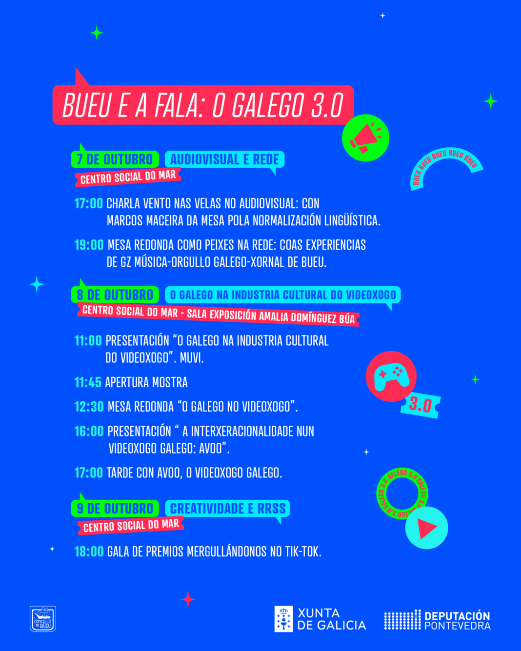 No marco da aposta polas políticas de promoción da lingua galega, o Concello de Bueu promove a próxima fin de semana as xornadas “Bueu e a fala: o galego 3.0”, que se organizan grazas ao apoio económico da Xunta de Galicia e da Deputación de Pontevedra, e que pretenden ofrecer unha reflexión arredor do emprego do galego nas redes sociais e nos novos medios. O programa estenderase dende o venres 7 de outubro ao domingo 9 e constará de charlas, presentacións de proxectos, exposición, mesas redondas e, o máis novidoso, o 1º Certame Mergullándonos no TikTok.