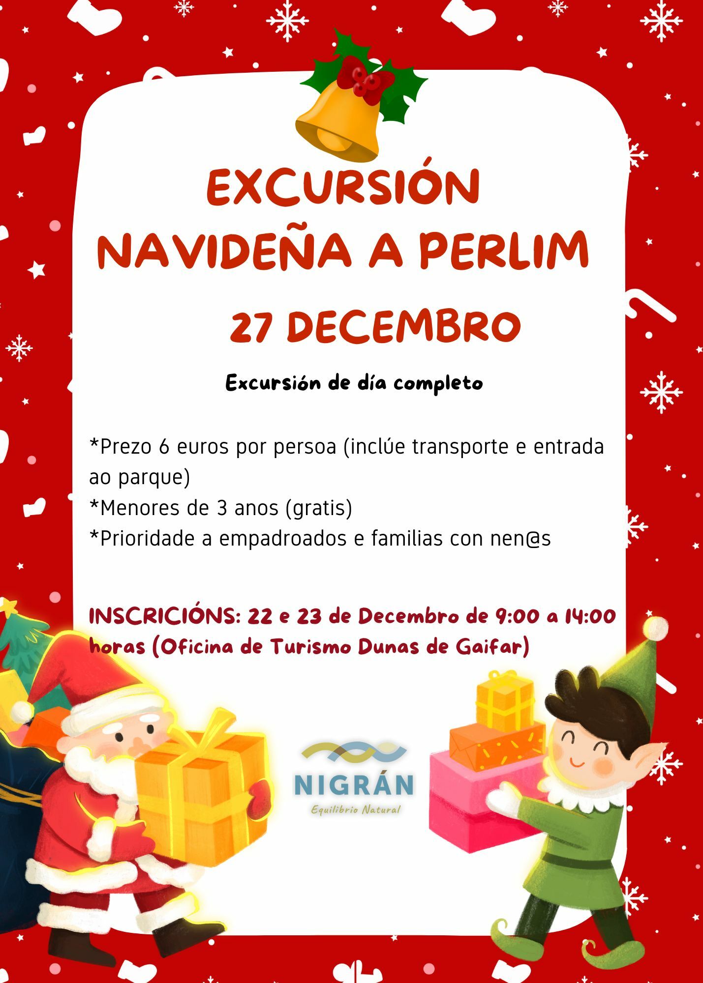 O Concello de Nigrán ofrece un ano máis unha excursión ao parque temático de Nadal máis grande de Portugal, Perlim, o martes 27 de decembro. A inscrición abrirá o xoves 22 e venres 23 de 9:00 a 14:00 horas na Oficina de Turismo de Dunas de Gaifar sendo un número limitado de prazas que seguirá unha rigorosa orde de inscrición con prioridade para os empadroados en Nigrán con crianzas. O prezo é de 6 € (os menores de 3 anos non pagan) e inclúen a entrada ao recinto e o transporte, tendo que abonarse no mesmo día da excursión. A hora prevista de saída é as 10:30 horas e a de chegada ás 22:30 horas.