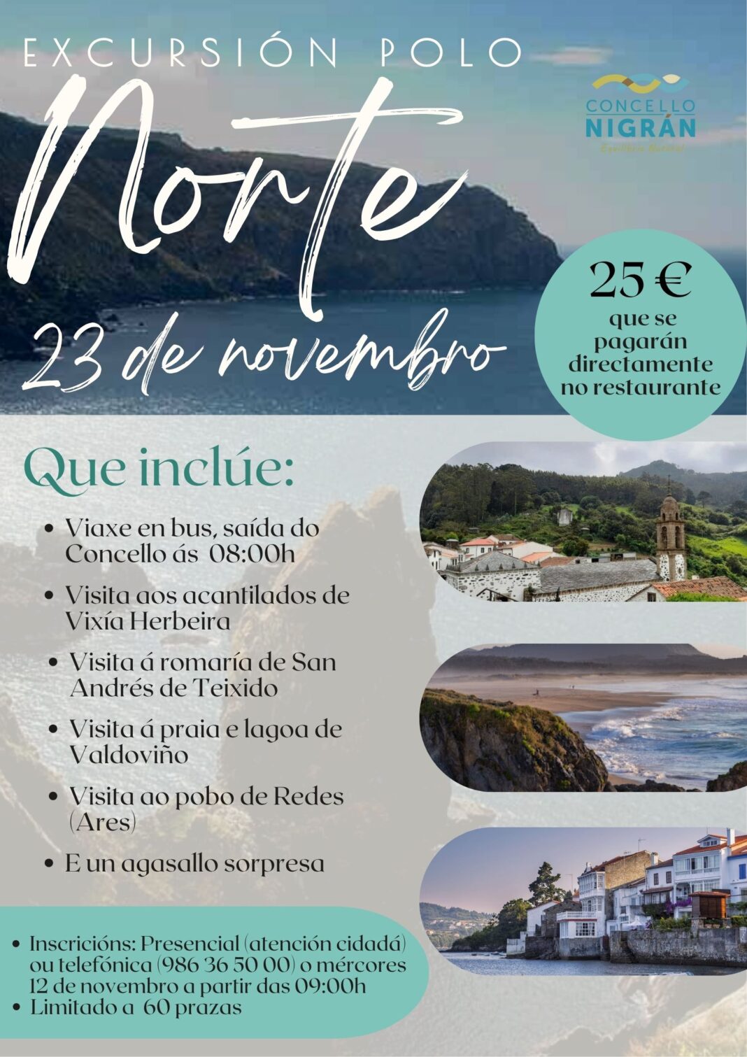 O Concello de Nigrán abre este mércores 12 de novembro a inscrición para participar o domingo 23 de novembro nunha excursión polo norte da provincia de A Coruña. Esta será durante toda a xornada (saída desde o Concello ás 8:00 horas) e inclúe visita aos acantilados de Vixía Herbeira, a romaría de San Andrés de Teixido, á praia e lagoa de Valdoviño e ao pobo de Redes (en Ares), estando limitada a 60 prazas e cun custe de 25 euros que os asistentes deberán pagar no propio restaurante Brisas de Valdoviño (o menú consta de empanada, pescada, tenreira, xeado, bebidas e café).