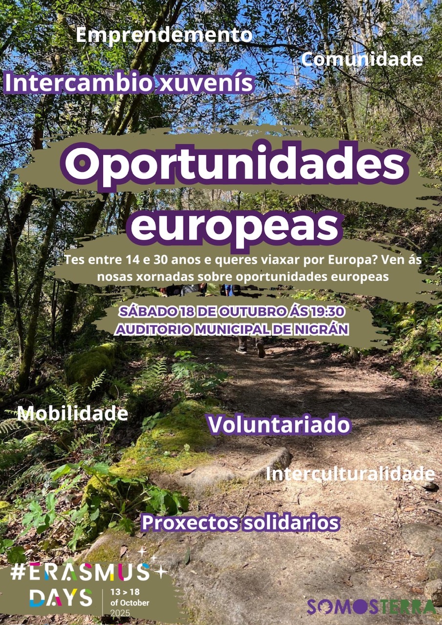 O Concello de Nigrán colabora este sábado 18 de outubro coa cooperativa Somos Terra (entidad que xestiona as horas municipais) para a partires das 16:15 no Auditorio Municipal, xunto a escritora Soledad García, dar a coñecer o voluntariado e diversas maneiras de levalo a cabo, tanto desde o punto de vista local como europeo. O obxectivo é promover entre a mocidade (entre 14 e 30 anos) o aproveitamento de proxectos de mobilidade e interculturais.