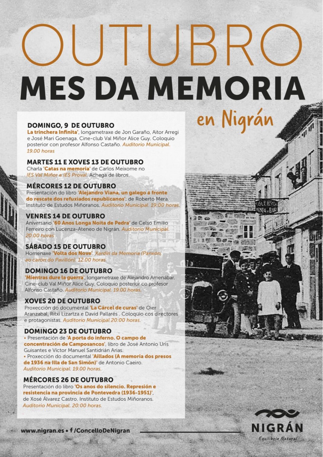 O Concello de Nigrán continúa este domingo 23 ás 19:00 horas no Auditorio Municipal coa programación do ‘Mes da Memoria Histórica’ coa presentación do libro ‘A porta do inferno. O campo de concentración de Camoposancos’ e o documental ‘Aillados (a memoria dos presos de 1936 na Illa de San Simón)’. En ambos casos estarán presentes os seus autores e se establecerá un coloquio posterior. A entrada é de balde ata completarse o aforo.