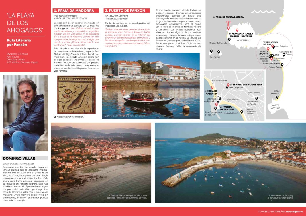 O Concello de Nigrán homenaxeará na Feria Internacional de Turismo (FITUR) ao aclamado escritor Domingo Villar (Vigo, 06.03.1971-18.05.22) presentando o roteiro literario ‘A Praia dos Afogados’, cuxa trama principal discorre pola parroquia de Panxón. Deste xeito, o Concello estrea en FITUR un folleto turístico específico en galego e castelán que reproduce os pasos do carismático personaxe Leo Caldas nesta internacionalmente famosa novela negra traducida a máis de 15 idiomas e levada ao cine no 2015. As persoas interesadas poderán atopalo físicamente na Oficina de Turismo de Panxón ou descargalo directamente na web www.nigran.es.