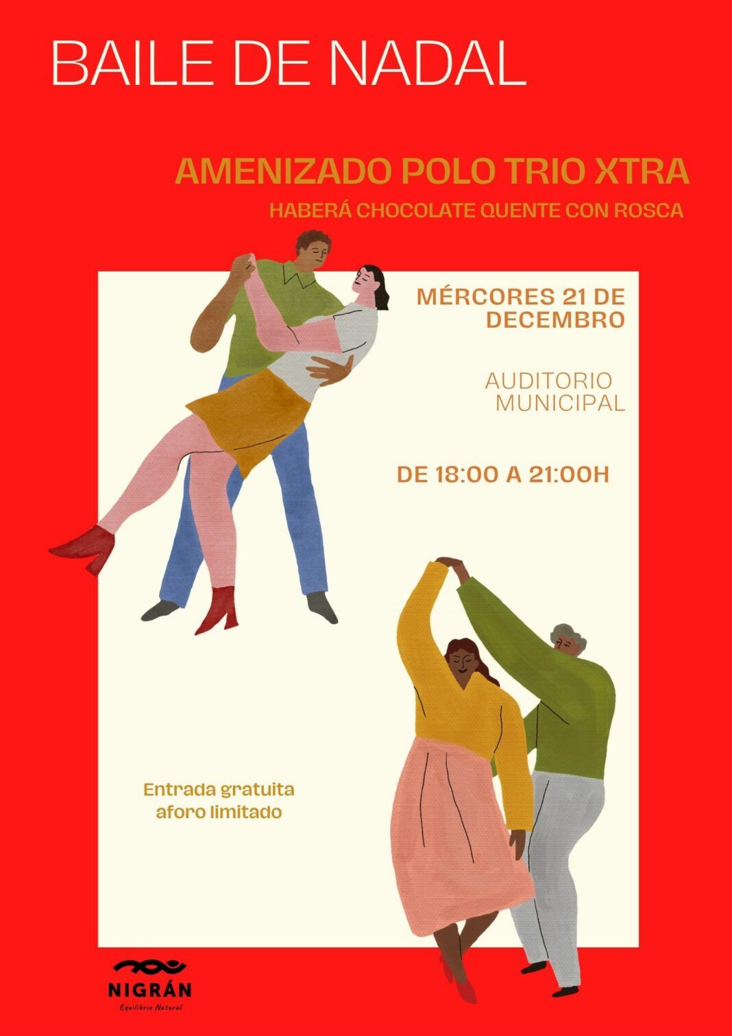 O Concello de Nigrán ofrece este mércores 21 de Decembro un baile de Nadal para todos os públicos de 18:00 a 21:00 horas no Auditorio Municipal e coa música en directo do Trío Xtra.