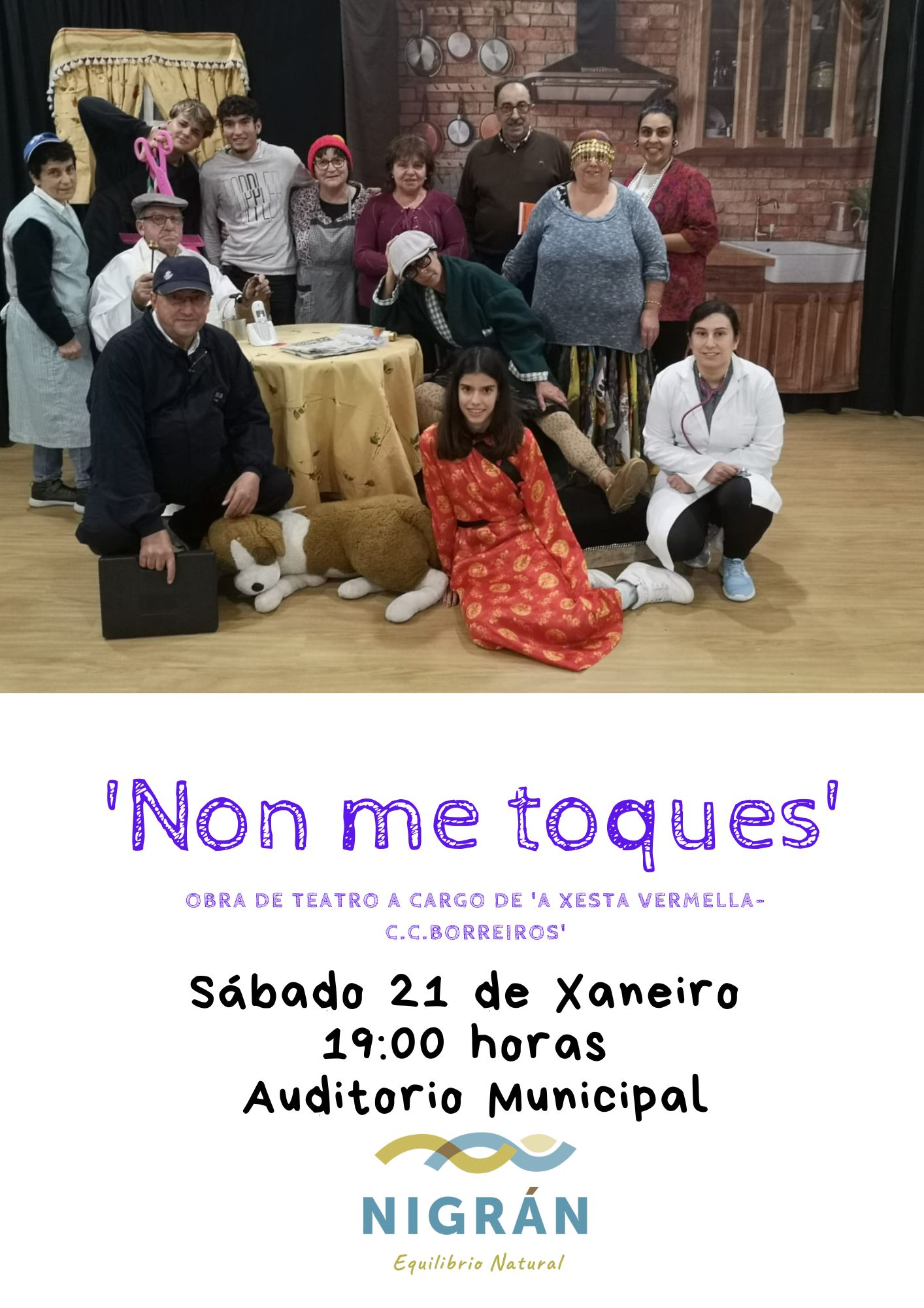 O Concello de Nigrán ofrece este sábado 21 de Xaneiro ás 19:00 horas no Auditorio Municipal a obra “Non me toques” a cargo da compañía gondomareña “A xesta vermella’, do Centro Cultural de Borreiros. A entrada é de balde ata completarse o aforo.