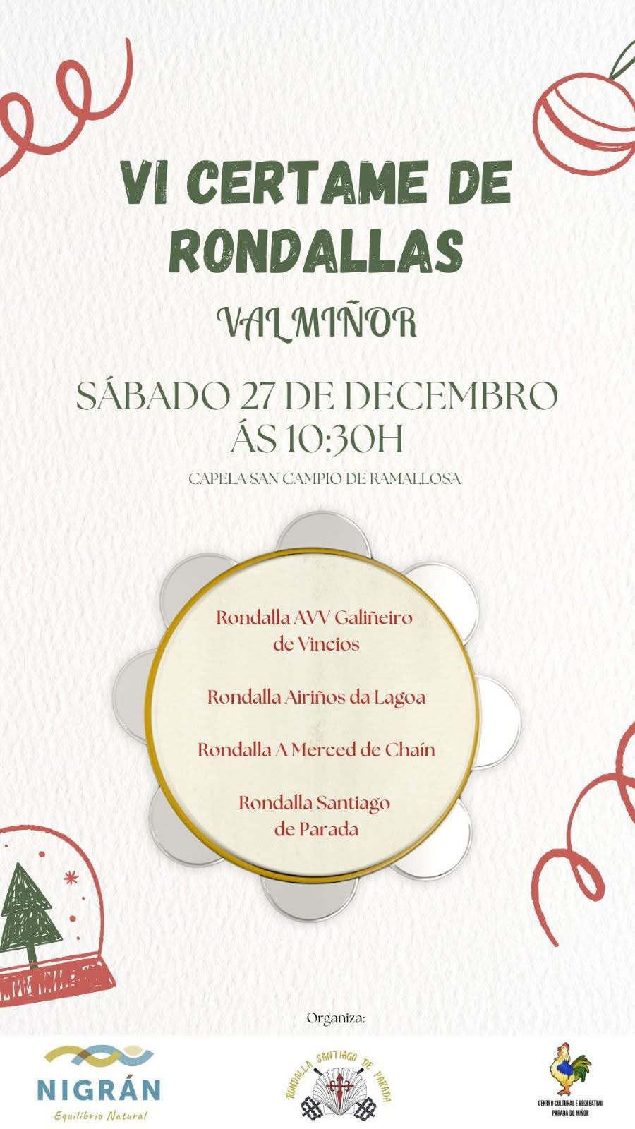 O Concello de Nigrán ofrece este sábado 27 de decembro o seu tradicional certame de rondallas na Alameda da Ramallosa a partir das 10:30 horas. A coral anfitriona de Santiago de Parada participa nesta sexta edición xunto á ‘A.V.V. Galiñeiro’ de Vincios, ‘A Merced’ de Chaín e ‘Airiños da Lagoa’. A rondalla de Santiago de Parada voverá a saír ás rúas de Nigrán, como é tradición, a tarde do 24 de decembro, despois na Cabalgata de Reis de Nigrán e en diferentes certames como o de Gondomar (6 de xaneiro), O Porriño (11 de xaneiro) ou no Ifevi (17 de xaneiro).