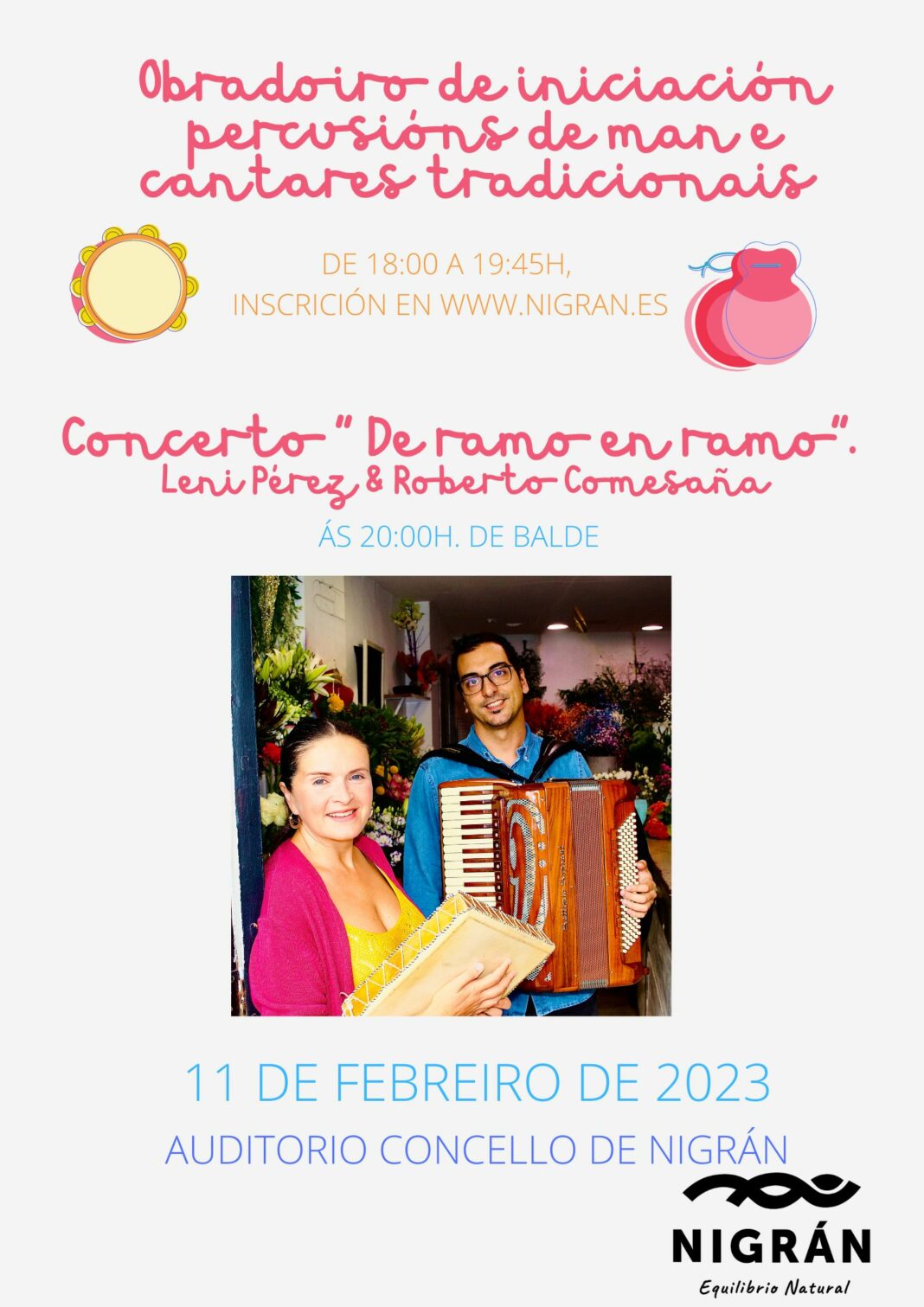 O Concello de Nigrán ofrece este sábado 11 de Febreiro ás 20:00 horas no Auditorio Municipal o concerto de Roberto Comesaña e Leni Pérez ‘De Ramo en Ramo’, título do seu primeiro disco conxunto. O reputado acordeonista de Priegue, gañador dun Grammy no 2016 con Cristina Pato, Ángel Pintos e Davide Salvado, une o seu talento ao da recompiladora, intérprete e folclorista Leni Pérez, moi coñecida pola súa intervención durante anos na TVG como especialista en folclore ou pola súa participación en grupos como Os Escaravellos ou Pelica de Can. Neste concerto, darán a coñecer ao público asistente un repertorio tradicional protagonizado pola voz, pandeiro e acordeón no que se porá en valor á figura de muller. A entrada é de balde ata completar o aforo.