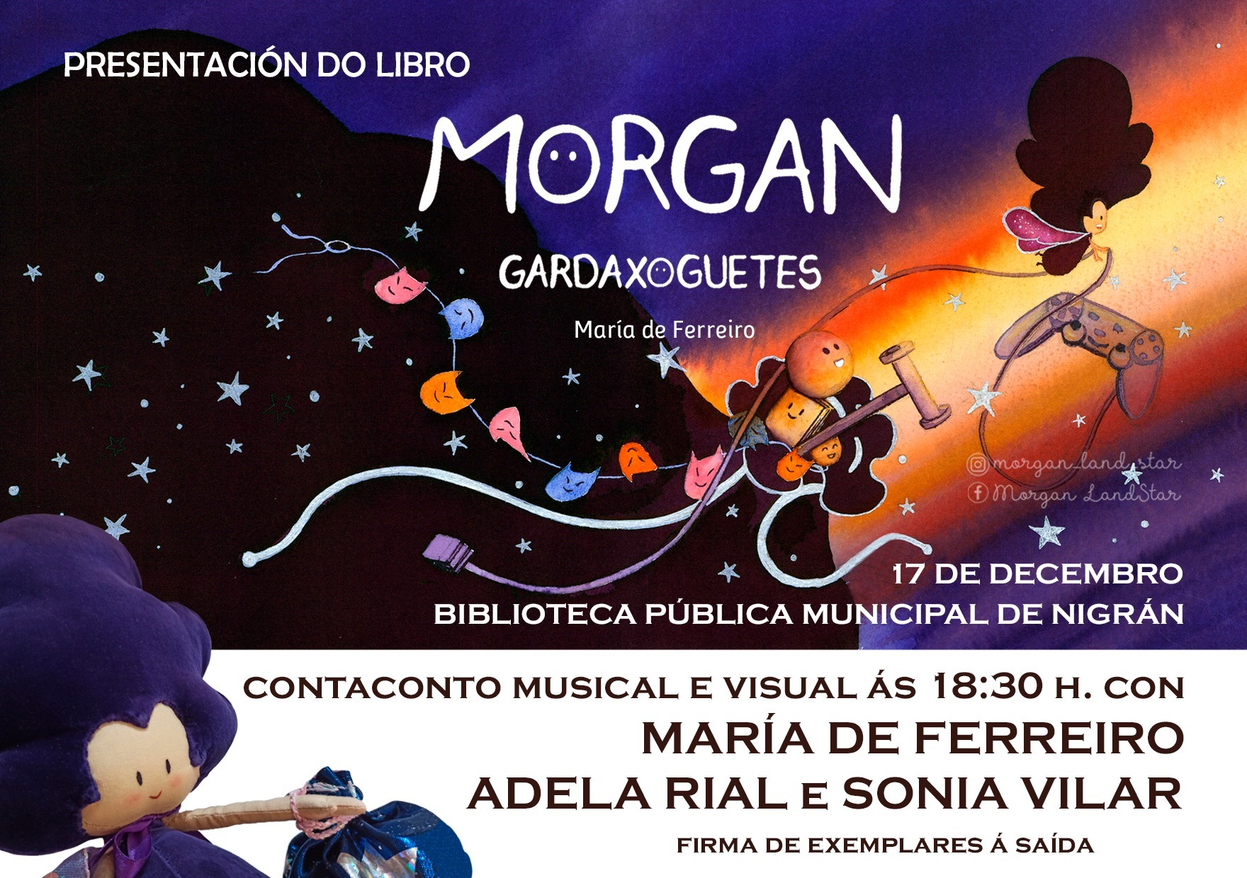 O Concello de Nigrán ofrece este sábado 17 de decembro ás 18:30 na Biblioteca Municipal o contacontos visual e musical ‘Morgan. Gardaxoguetes’ coa presenza da súa autora, María de Ferreiro, e dúas colaboradoras, Adela Rial e Sonia Vilar. O libro Morgan Gardaxoguetes está dirixido a tódalas persoas con cativada na casa que aínda cre na maxia. É un instrumento eficaz para axudar a quen lles custa ordenar os xoguetes. O libro presenta a primeira aventura de Morgan Land Star, a primeira Gardaxoguetes do mundo, unha fada que ensina ás crianzas a recoller despois de xogar, senon pola noite, ela vainos a levar. A esta fada máxica gústalle presentar o seu libro compañada de música e cancións que fan a delicia de todo o público, grandes e peques. Ao remate da presentación, a autora María de Ferreiro adoita firmar exemplares do libro.