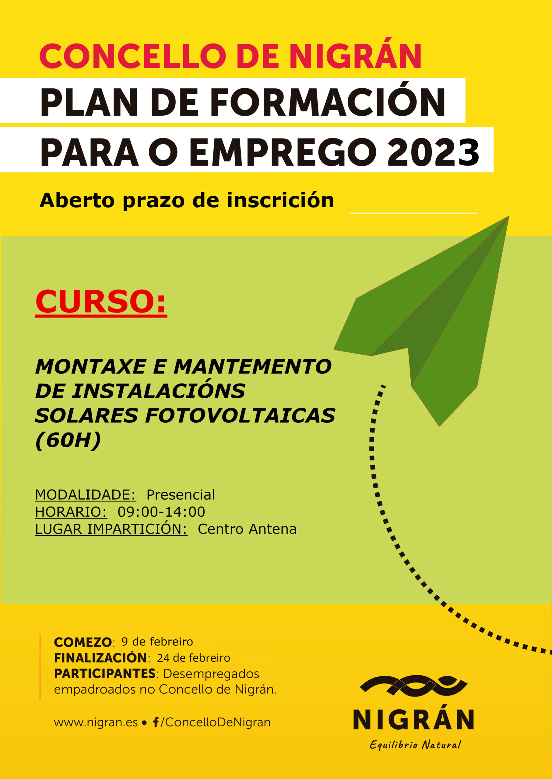 O Concello de Nigrán, dentro do seu ‘Plan de Formación e Emprego 2023’, ofrece un curso gratuíto de montaxe e mantemento de instalacións solares fotovoltaicas destinado a veciñanza desempregada ante a alta demanda por parte das empresas deste tipo de profesionais. O período de inscrición está aberto ata o luns 30 de Xaneiro ben a través de Rexistro (Planta baixa do Concello, de 9:00 a 14:00) ou Sede Electrónica. O curso desenvolverase durante 60 horas do 9 ao 24 de febreiro de 9:00 a 14:00 no Centro Antena.