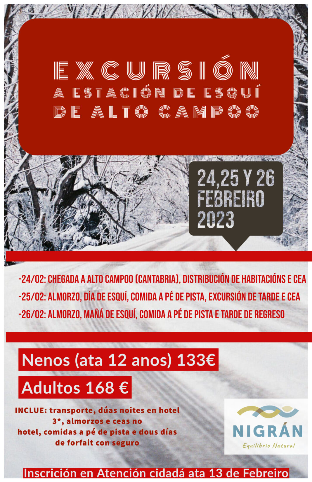 O Concello de Nigrán, co fin de democratizar a práctica deportiva do esquí, ofrece unha excursión á estación de Alto Campoo (Cantabria) do 24 ao 26 de Febreiro cun prezo de 133 € para menores de ata 12 anos e 168 € para adultos. O prezo inclúe transporte, dúas noites de hotel 3 estrelas, almorzo e cea no hotel, comidas a pé de pista e 2 días de forfait con seguro. O prazo de inscrición é ata o 13 de Febreiro na Oficina de Información Cidadá (planta baixa do Concello de Nigrán).