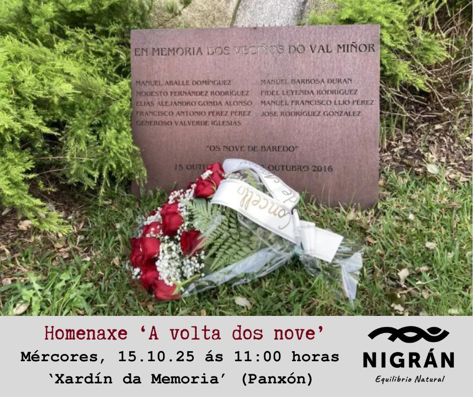 O Concello de Nigrán conmemorará un ano máis este mércores 15 de outubro ás 11:00 horas o 89 aniversario dos tráxicos asasinatos coñecidos como ‘A volta dos nove’. Así, nun acto aberto aberta á participación da veciñanza e coa presenza de familiares dos represariados, o alcalde de Nigrán realizará unha ofrenda floral ante o seu monumento no ‘Xardín da Memoria’ de Panxón, espazo inaugurado no 2016 e que consta dunha escultura en pedra con 9 cruces referidas aos nove asasinados e tamén sendas placas que os recorda a eles, as súas mulleres, e a Dolores Samuelle, asasinada por axudar aos ‘Ineses’.