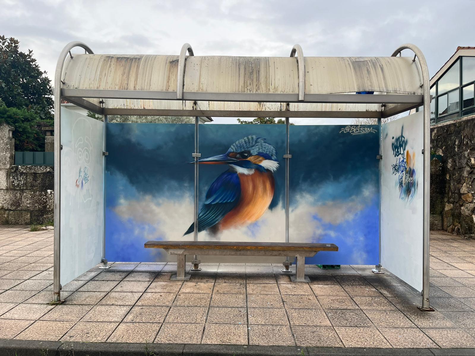 “Son de Coruxo, Vigo, pero sempre fixen moita vida por Nigrán, por iso quería ofrecer algo que de verdade achegase algún valor á comunidade”, explica Pedro González, coñecido artísticamente como Beis e quen aos seus 25 anos se gaña a vida principalmente coa pintura mural. Sen embargo, este traballo encargado polo Concello foi máis alá de reformular a estética das marquesiñas, xa que antes tivo que investigar para seleccionar algunha das 12 aves máis representativas da zona. A orde das mesmas tampouco foi ao azar, “as especies máis chamativas as deixei para as paradas con maior visilidade, como a garza real”, matiza. Así, comeza coa píllara das dunas no cruce da Estrada pola Vía con Patos e continúa pola costa ata a Ramallosa con ostraceiro, virapedras, negrón común, colimbo chico, correlimo, cormorán, gaivota común, garza real, martín pescador, bisbita común e charrán. Pese a ser diferentes, todas compartirán unha paleta de cores comúns para ofrecer unha estética de conxunto. “Esta será a nova nomenclaturas das paradas de autobús en Nigrán”, sintetiza o alcalde.