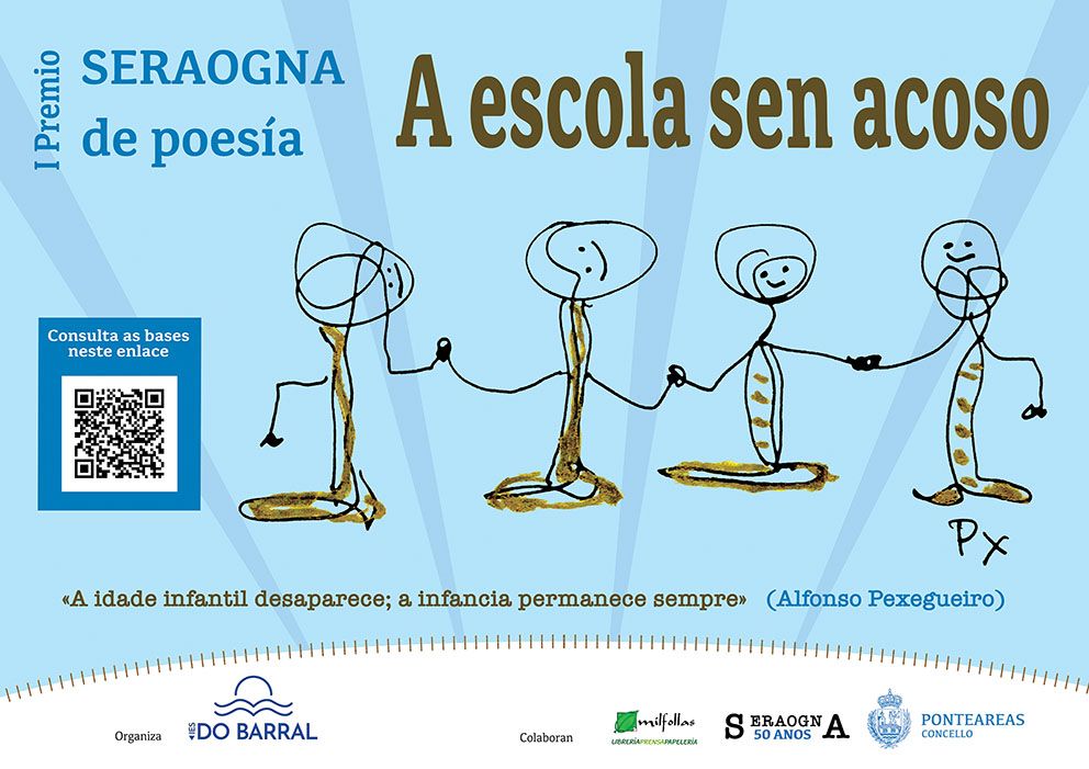 ”O Concello de Ponteareas convida a participar no I Premio Seraogna de poesía “A escola sen acoso”, unha iniciativa organizada polo IES do Barral, en colaboración coa libraría MilFollas, co obxectivo de render homenaxe ao poeta ponteareán Alfonso Pexegueiro e, ao mesmo tempo, sensibilizar á comunidade educativa contra o acoso e o maltrato na infancia.