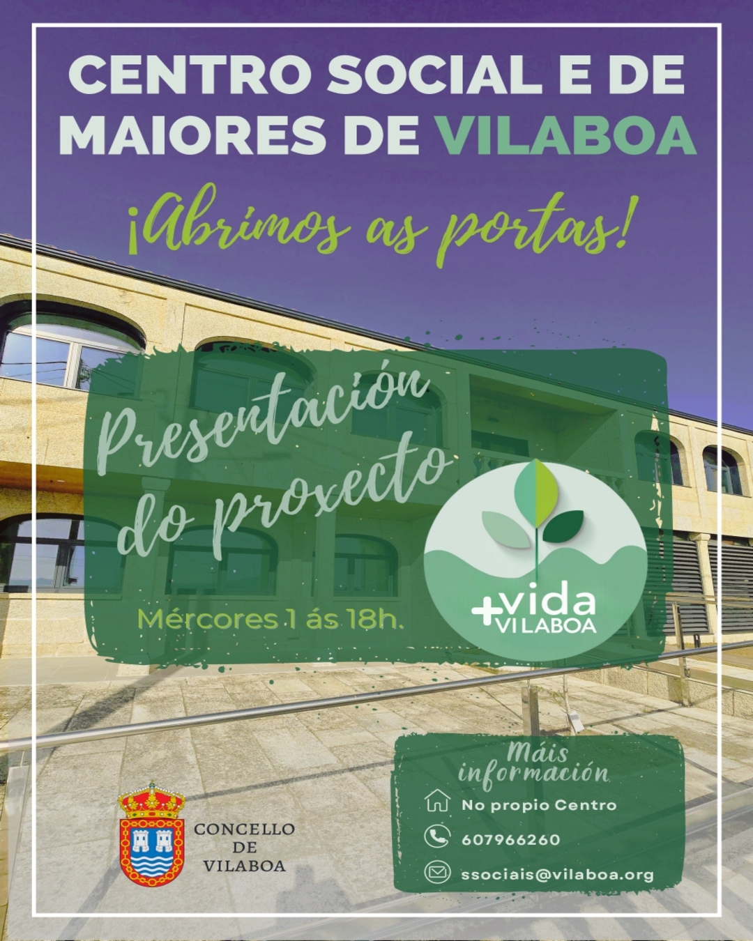 Este mércores 1 de outubro ás 18:00 horas terá lugar a presentación oficial do proxecto +Vida Vilaboa nas propias instalacións do centro aberto a toda a cidadanía. Este evento será a primeira oportunidade para que a veciñanza coñeza de primeira man as instalacións e os servizos que ofrecerá este novo espazo.