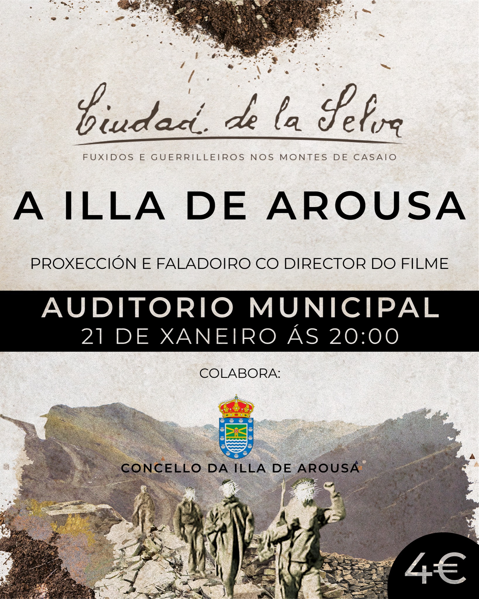 Tan so uns meses despois da súa estrea oficial chega ao Auditorio de A Illa de Arousa a proxección de “Ciudad de la Selva. Fuxidos e guerrilleiros nos montes de Casaio”, un documental de Miguel Riaño centrado no refuxio que a guerrilla creou nos montes de Casaio, en Carballeda de Valdeorras, un lugar no que viviron entre 1941 e 1946 arredor de medio centenar de persoas de xeito estable, segundo as conclusións as que chegou Sputnik Labrego, o colectivo que excavou o lugar en función dos achados na zona.