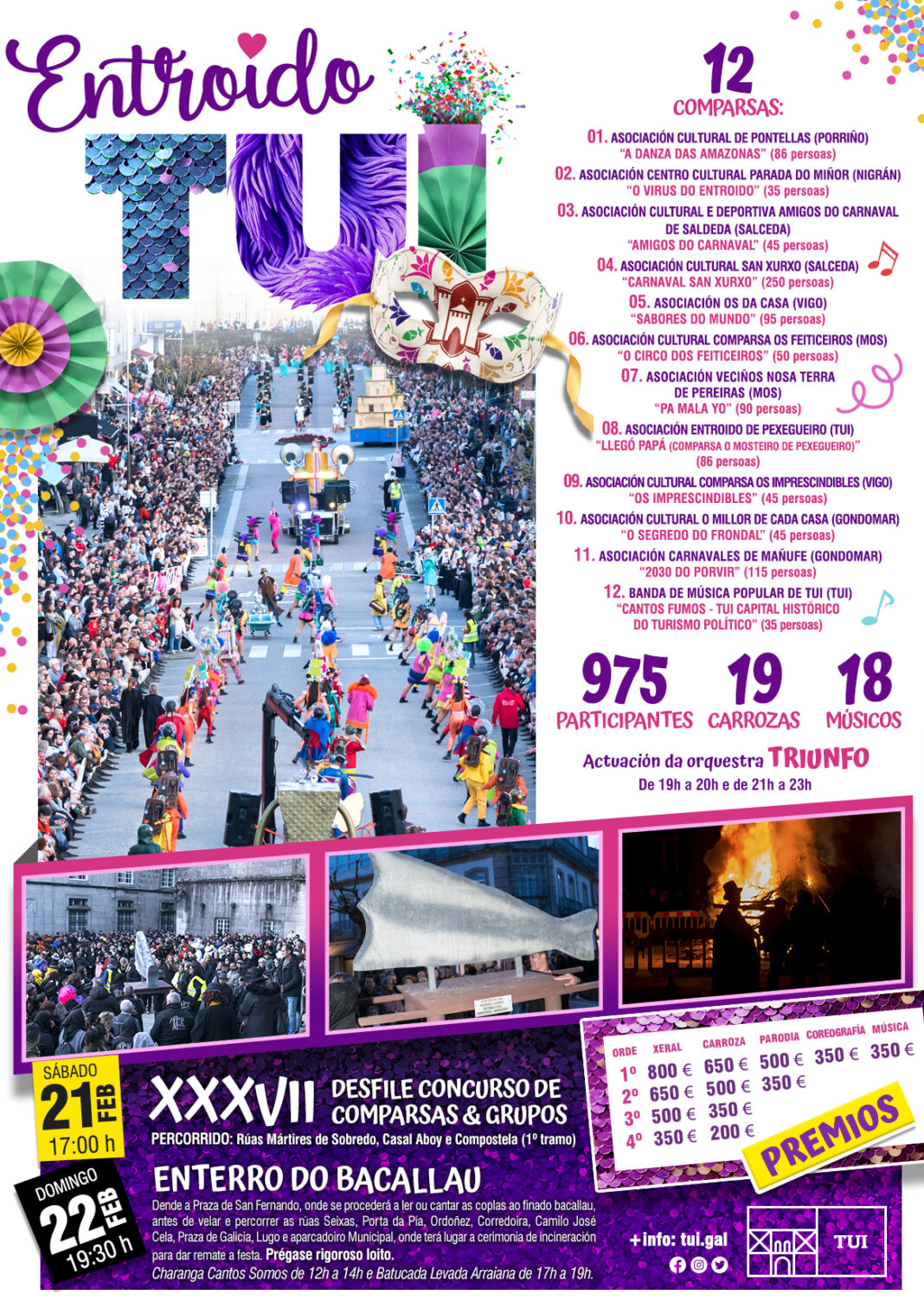 Xa o domingo Tui despedirá o Entroido coa celebración do Enterro do Bacallau. Unha cita festiva de rigoroso loito na que participarán as doce comparsas xunto a centos de persoas. Sairá ás 19.30 h dende a praza de San Fernando, onde terá lugar a lectura das coplas, e continuará pola rúa Seixas, Porta da Pía, Ordóñez, Corredoira, Camilo José Cela, Praza de Galicia, e Lugo, para rematar no aparcamento municipal, onde terá lugar a incineración do Bacallau.