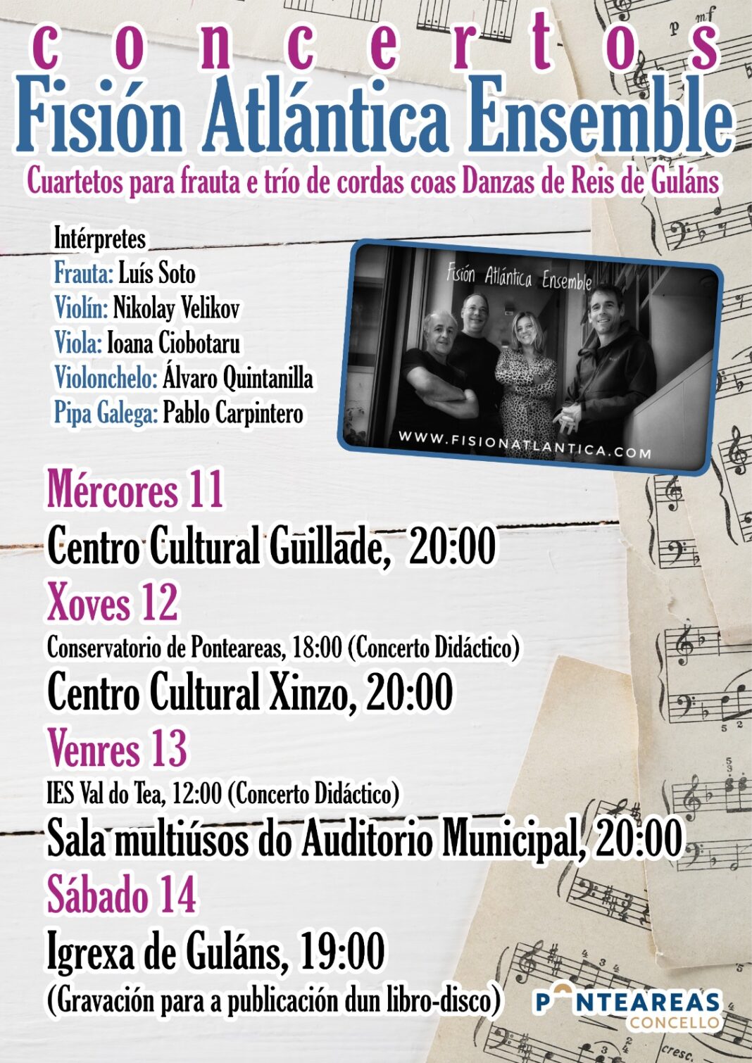 Este ciclo de concertos organizado polo Concello de Ponteareas comezará este mércores 11 de xaneiro ás 20.00 horas no Centro Cultural de Guillade e continuará o xoves 12 con sesión dobre, ás 18.00 horas cunha actuación didáctica no Conservatorio de Ponteareas e ás 20.00 horas no Centro Cultural de Xinzo. O venres 13 Fisión Atlántica Ensamble encherá coa súa música o IES Val do Tea para un novo concerto didáctico ás 12.00 horas para o alumnado e cunha actuación ás 20.00 horas na sala multiúsos do auditorio municipal.