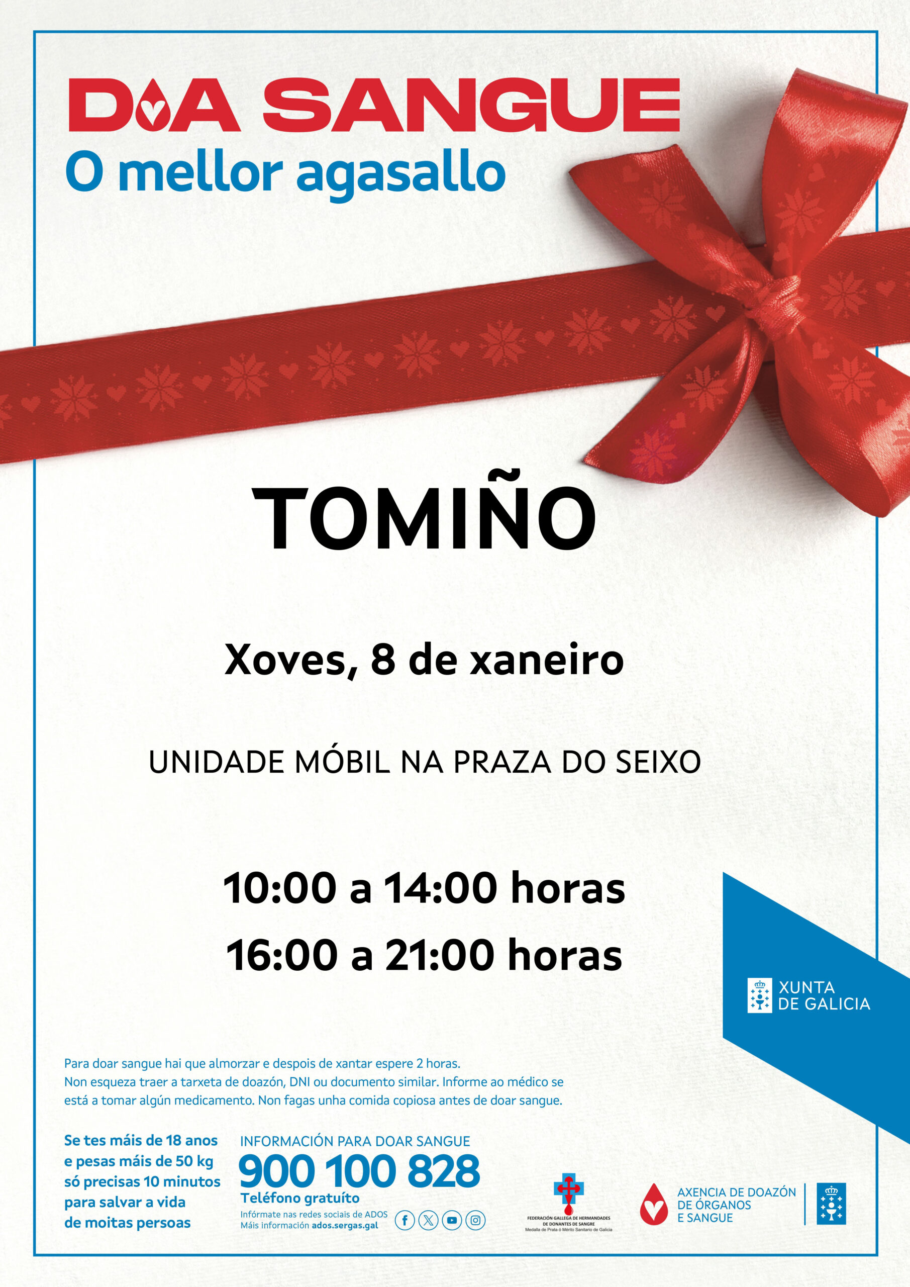 En Tomiño o mellor agasallo de Reis é unha pinga de solidariedade. O vindeiro xoves 8 de xaneiro, unha unidade móbil da Axencia Galega de Doazón de Órganos e Sangue estará na Praza do Seixo de 10.00 a 14.00 e de 16.00 a 21.00 horas coas portas abertas para todas aquelas persoas que queiran achegarse a doar.