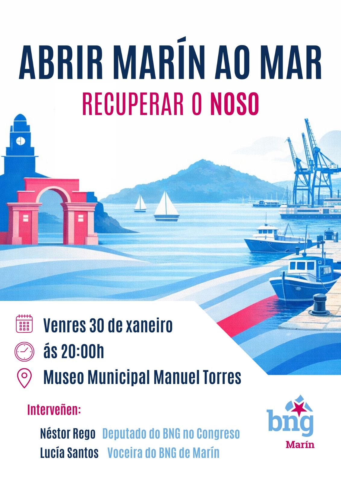 O Bloque Nacionalista Galego (BNG) celebrará este venres 30 de xaneiro, ás 20:00 horas, no Museo Municipal Manuel Torres, o acto público “Abrir Marín ao mar, recuperar o noso”, para explicar o proxecto Abrir Marín ao Mar e abrir un espazo de información e debate sobre a recuperación do litoral de Marín.