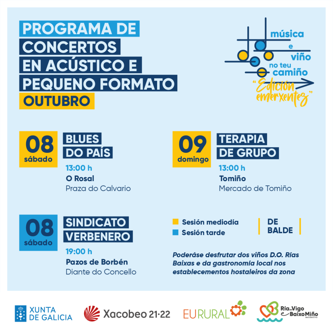 Este sábado 8 de outubro Blues do país estará na Feira do Viño do Rosal e Sindicato Verbenero diante da Casa do Concello de Pazos. O domingo será a quenda de Terapia de Grupo, que actuará no mercado tomiñés
