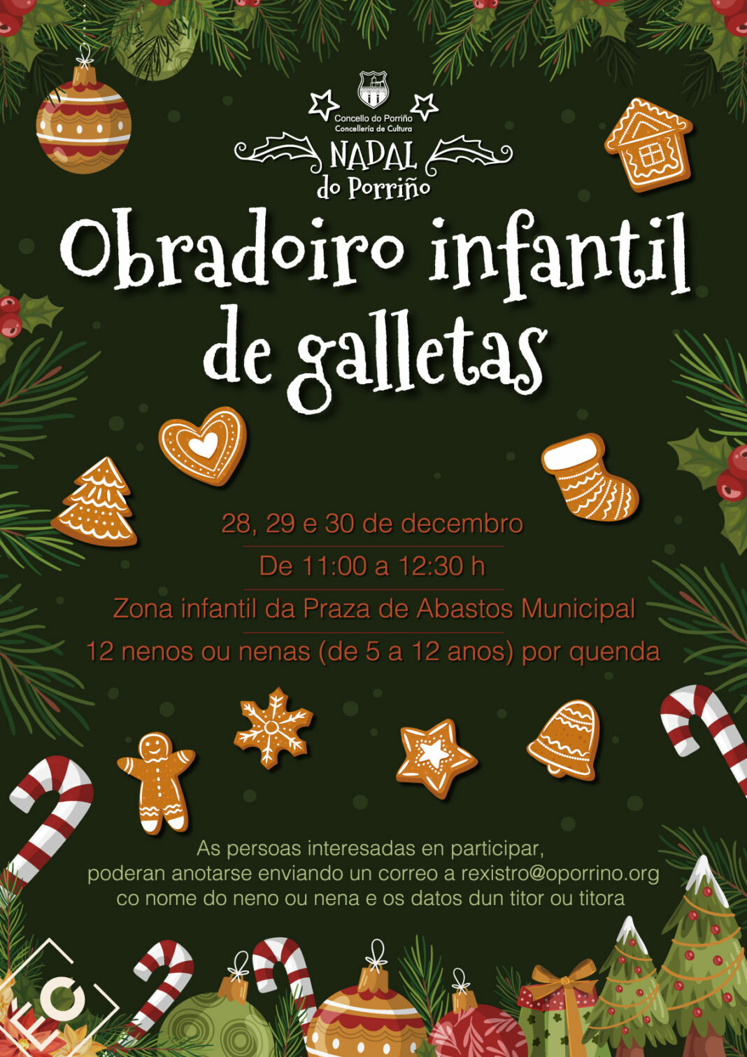 Que mellor maneira de gozar das festas do Nadal que poñéndose mans á masa e cociñar ricas galletas. Por iso, o Concello do Porriño organiza, dentro da programación festiva, un Obradoiro infantil de elaboración e decoración de galletas de Nadal dirixido ás nenas e nenos de 5 a 12 anos.