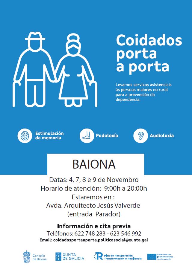A campaña de “Coidados porta a porta” que ofrece coidados médicos gratuítos a maiores de 55 anos chegará a Baiona a próxima semana. O goberno local, a través da Concellería de Servizos Sociais, solicitou á Xunta este servizo, que se presta mediante unidades móbiles que realizan visitas de varios días aos municipios rurais. Nestes vehículos ofrécense servizos de oftalmoloxía, audioloxía, podoloxía e estimulación da memoria ás persoas que non teñen facilidades para acceder a estas prestacións.