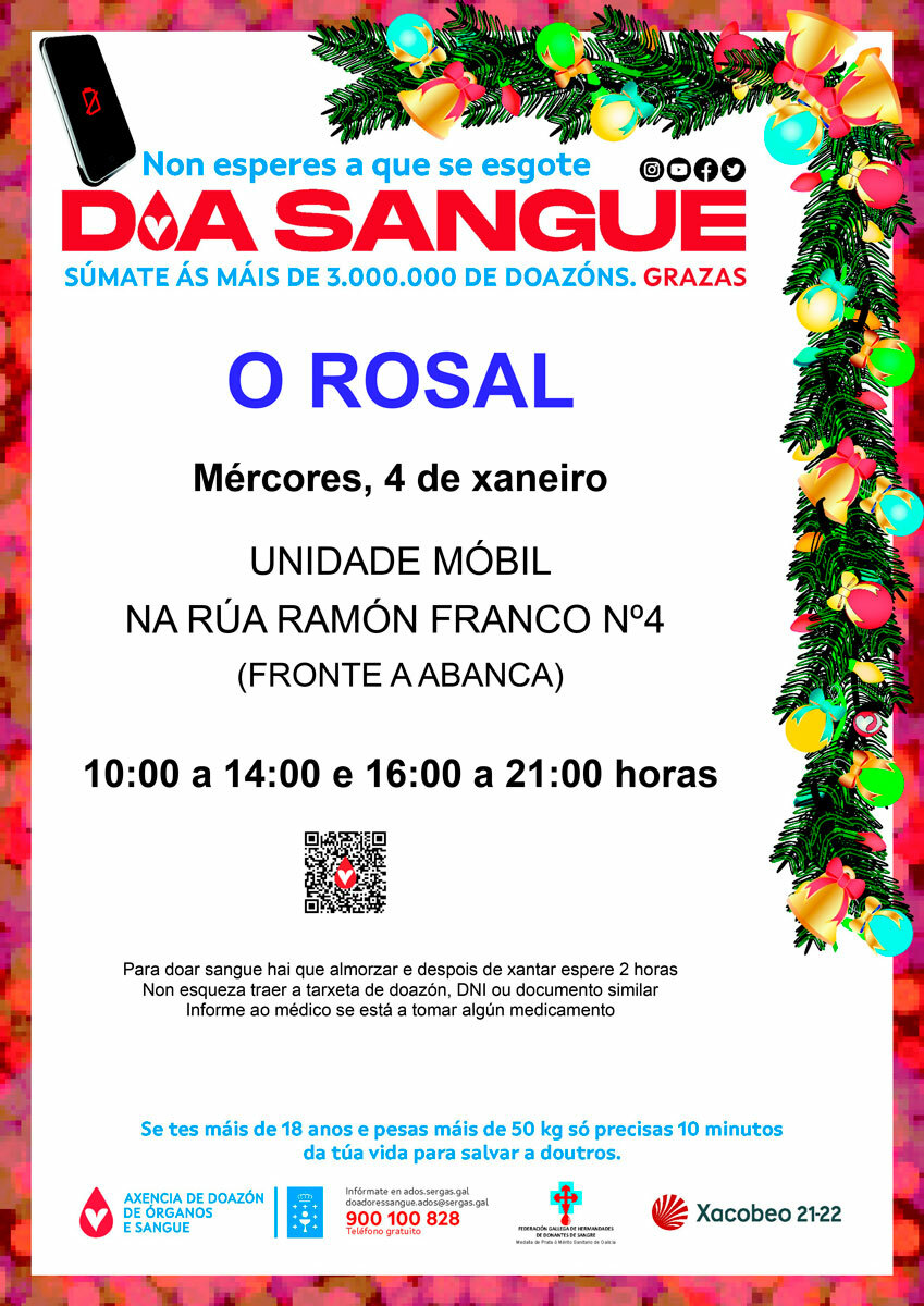 O Rosal comeza o ano achegando a súa pinga de solidariedade. O Concello acolle o vindeiro mes de xaneiro unha nova visita dunha das unidades móbiles da Axencia Galega de Doazón de Sangue, Órganos e Tecidos (ADOS), que estará dispoñible o mércores día 4 para todas aquelas persoas que queiran achegarse a doar. Como ven sendo habitual, o autobús estará situado na rúa Ramón Franco, nº 4, fronte á sucursal de Abanca, e os rosaleiros e rosaleiras poderán doar sangue de 10.00 a 14.00 e de 16.00 a 21.00 horas. Todas as persoas que desexen doar sangue poderán solicitar cita previa chamando ao teléfono gratuíto 900 100 828.