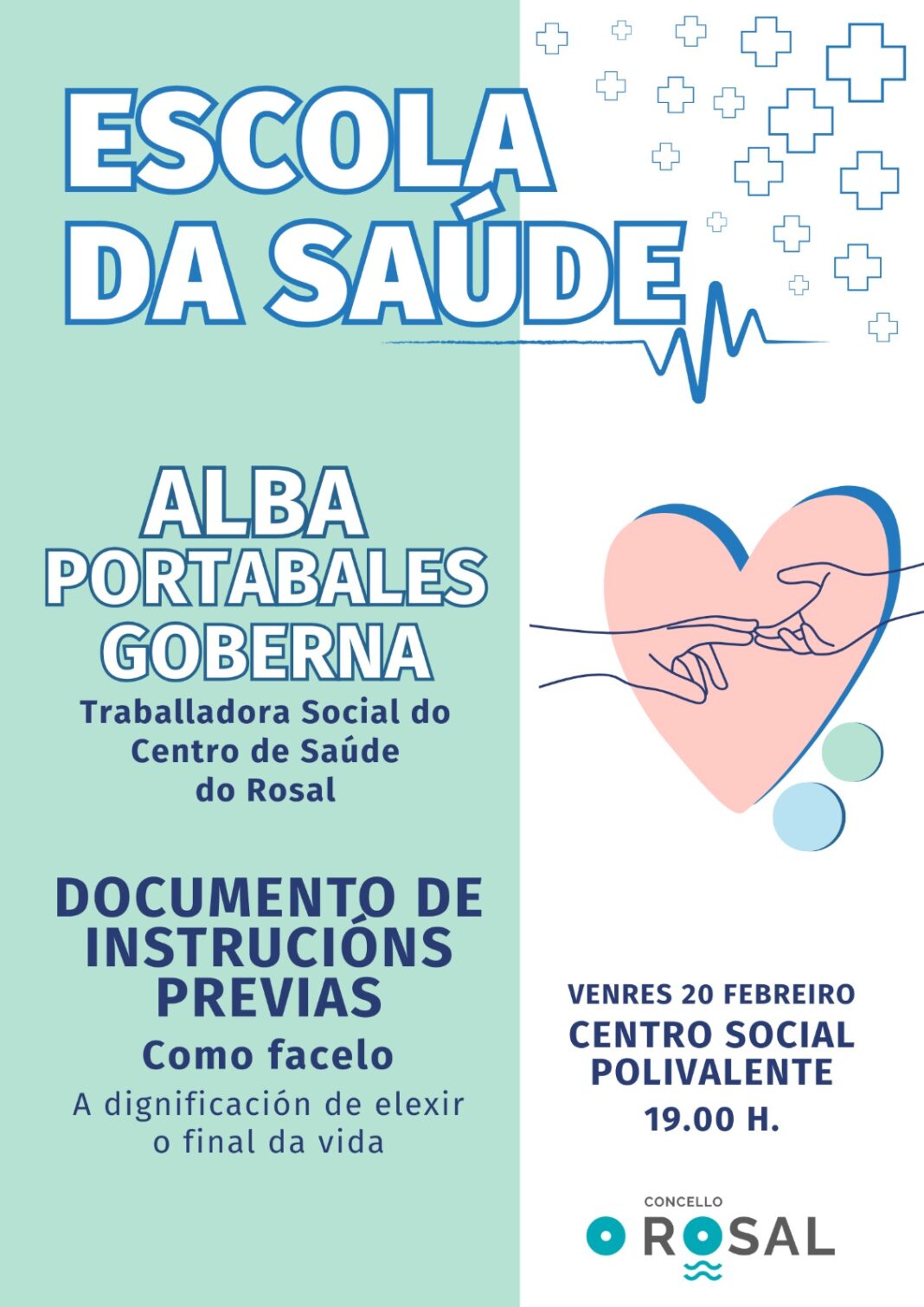O programa comezará o vindeiro venres 20 de febreiro da man de Alba Portabales Goberna, traballadora social do Centro de Saúde do Rosal, que abordará co público o documento de instrucións previas, o que antes era coñecido como testamento vital. A sesión, ás 19.00 horas no Centro Social Polivalente, será de balde e con entrada libre ata completar aforo.