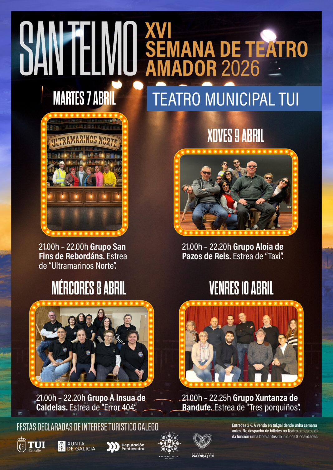 O teatro ten un oco propio na programación das Festas de San Telmo nunha cita consolidada que cada ano ateiga o patio de butacas do Teatro Municipal de Tui. Trátase da Semana do Teatro Amador na que os grupos de teatro afeccionado das distintas parroquias tudenses levan as súas obras da temporada a escena na semana grande dos festexos tudenses.  Nos últimos anos os distintos grupos adoitan estrear as novas obras precisamente durante esta semana, e así acontecerá de novo neste 2026. Todas apostan polo humor representando comedias da autoría da propia agrupación.