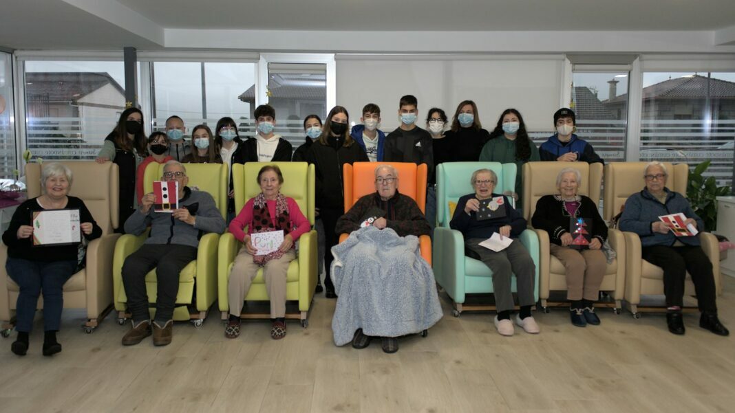 Integrantes de Voces Novas, promotores do programa ‘Unha postal polo Nadal’, entregaron medio cento das cartas personalizadas ás persoas maiores destes centros
