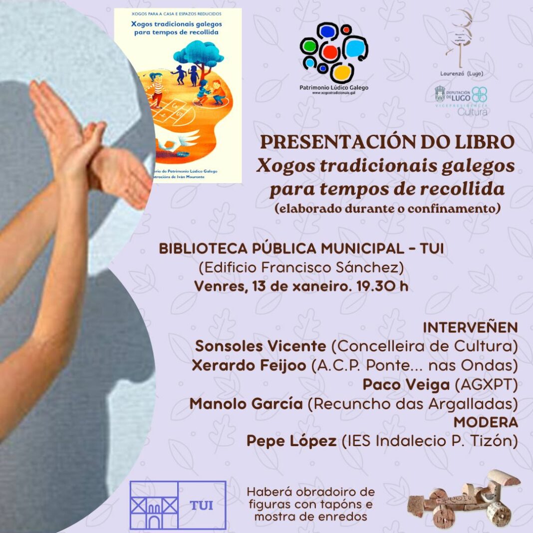 Este venres, 13 de xaneiro, ás 19.30 h na Biblioteca Municipal de Tui, terá lugar a presentación do libro “Xogos tradicionais galegos para tempos de recollida”. Esta publicación foi elaborada durante o confinamento polo Observatorio do Patrimonio Lúdico Galego e destinado para o enredo neses espazos reducidos en clima familiar. Trátase dunha ampla e variada mostra de xogos e brinquedos de doada realización que axudan á convivencia harmónica e á socialización.