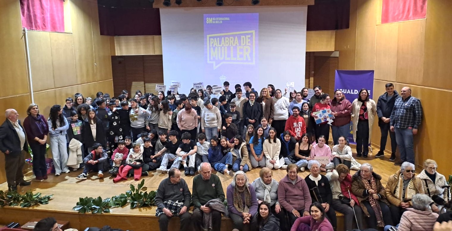 O auditorio da Xunqueira acolleu este mediodía o acto institucional co gallo do 8M. O lema da campaña “Palabra de Muller” quere reivindicar algo básico pero que en demasiadas ocasións foi “silenciado ou cuestionado, a nosa voz”, lembra a alcaldesa, Digna Rivas. No acto participaron diferentes entidades e colectivos. Nesta ocasión os colexio Santa Mariña e Igrexa, o IES Mendiño, os Centros de Día, e as asociacións Andaina e Lenda. A actriz Olga Cuervo foi a encargada de ler o manifesto institucional do Concello de Redondela. Nel deféndese a igualdade real como piar da democracia e esixe políticas transversais para erradicar a violencia machista. Reivindica o feminismo “como motor social” e establece compromisos concretos: impulsar a corresponsabilidade, educar en valores desde a infancia, visibilizar o talento feminino local e garantir recursos públicos para eliminar a desigualdade estrutural. A concelleira de Igualdade, Iria Vilaboa, explicou que desde o Concello búscase a implicación de toda a sociedade nestes actos. Este ano as palabras de todos os participantes simbolizarán “a diversidade, a loita e os avances cara a igualdade” nunha exposición que se inaugurará mañá martes no Multiúsos da Xunqueira.