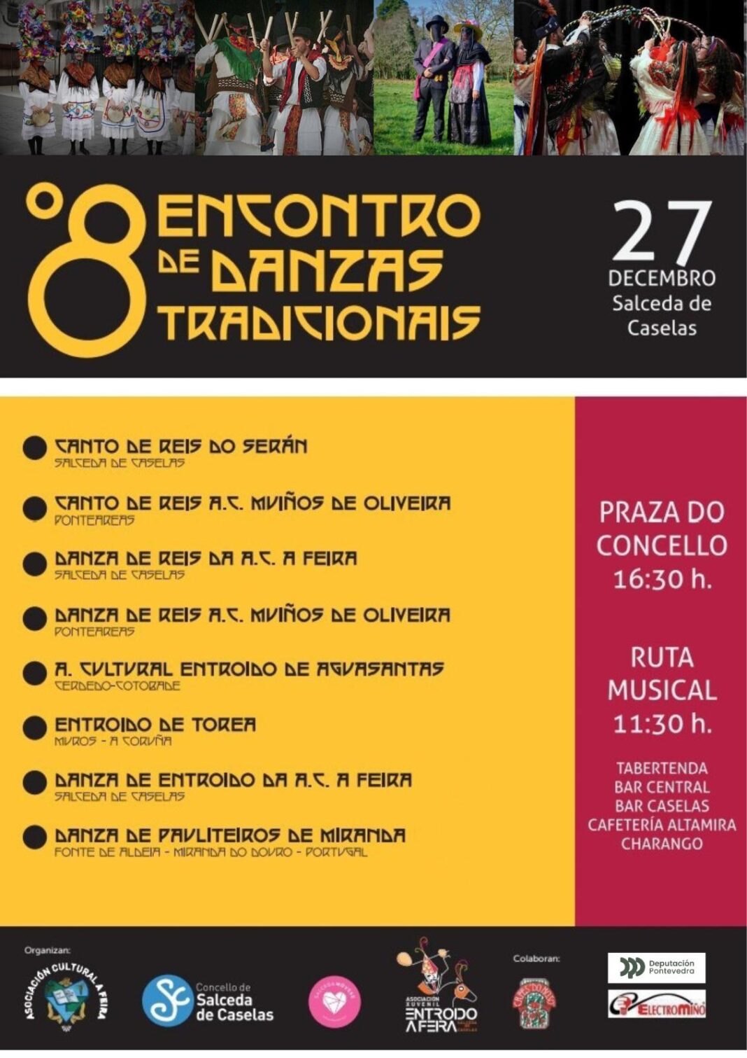 A Asociación Cultural A Feira, en colaboración co Concello de Salceda de Caselas, organiza o 8º Encontro de danzas tradicionais, que se celebrará o vindeiro sábado 27 de decembro na Praza do Concello. Nesta ocasión, ademais do grupo anfitrión que presentará as danzas de reis e de entroido, e do grupo O Serán que fará o canto de Reis de Salceda, poderemos gozar coa presentación de outras danzas chegadas de diferentes puntos de Galicia e Portugal.