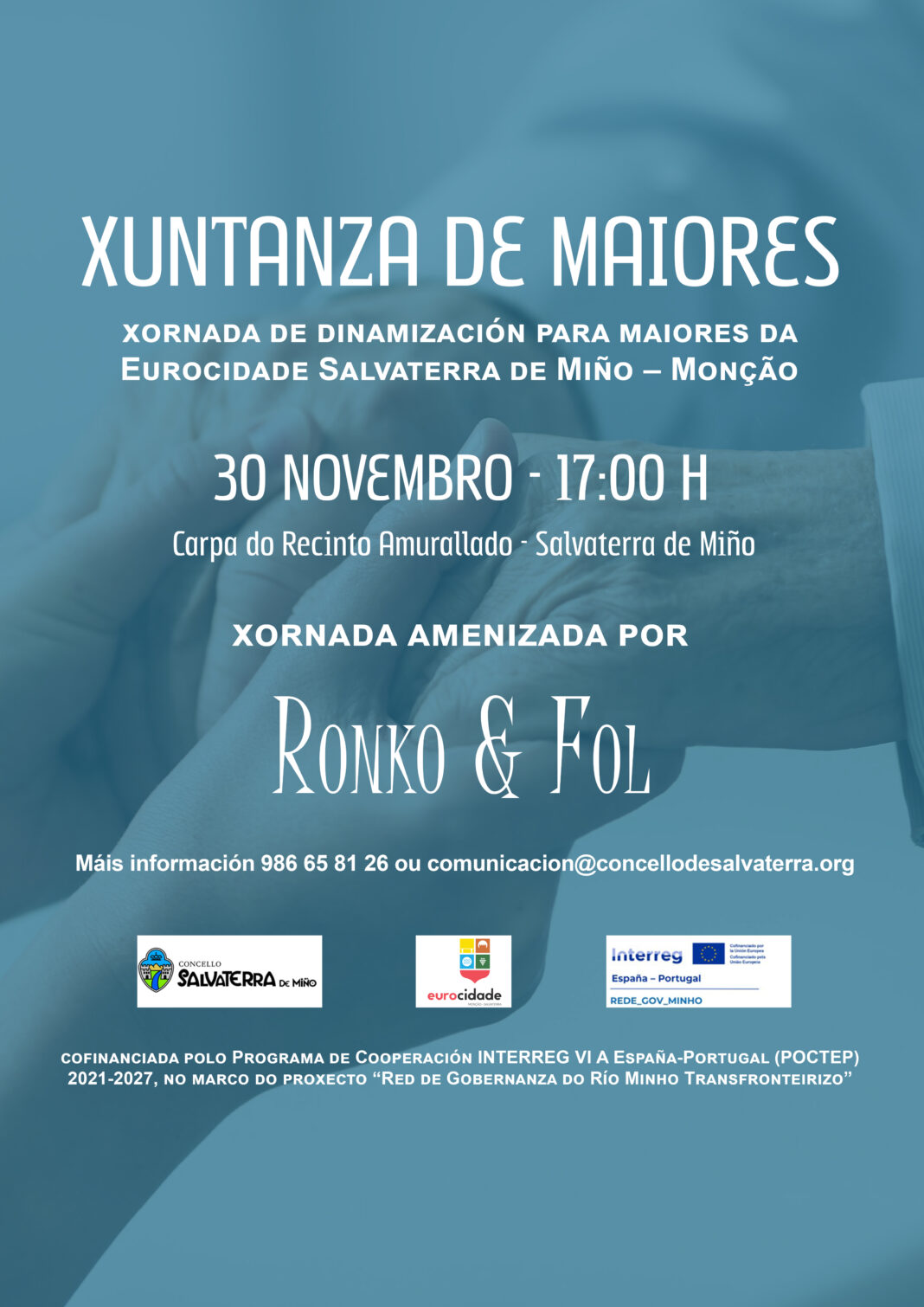 O vindeiro domingo 30 de novembro, a partir das 17:00 horas, terá lugar en Salvaterra de Miño na carpa do recinto amurallado a “Xuntanza de Maiores”, unha xornada de dinamización social dirixida ás persoas de 65 anos ou máis dos municipios que conforman a Eurocidade Salvaterra de Miño – Monção. A actividade está cofinanciada polo Programa de Cooperación INTERREG VI A España-Portugal (POCTEP) 2021-2027, no marco do proxecto “Red de Gobernanza do Río Minho Transfronteirizo”.