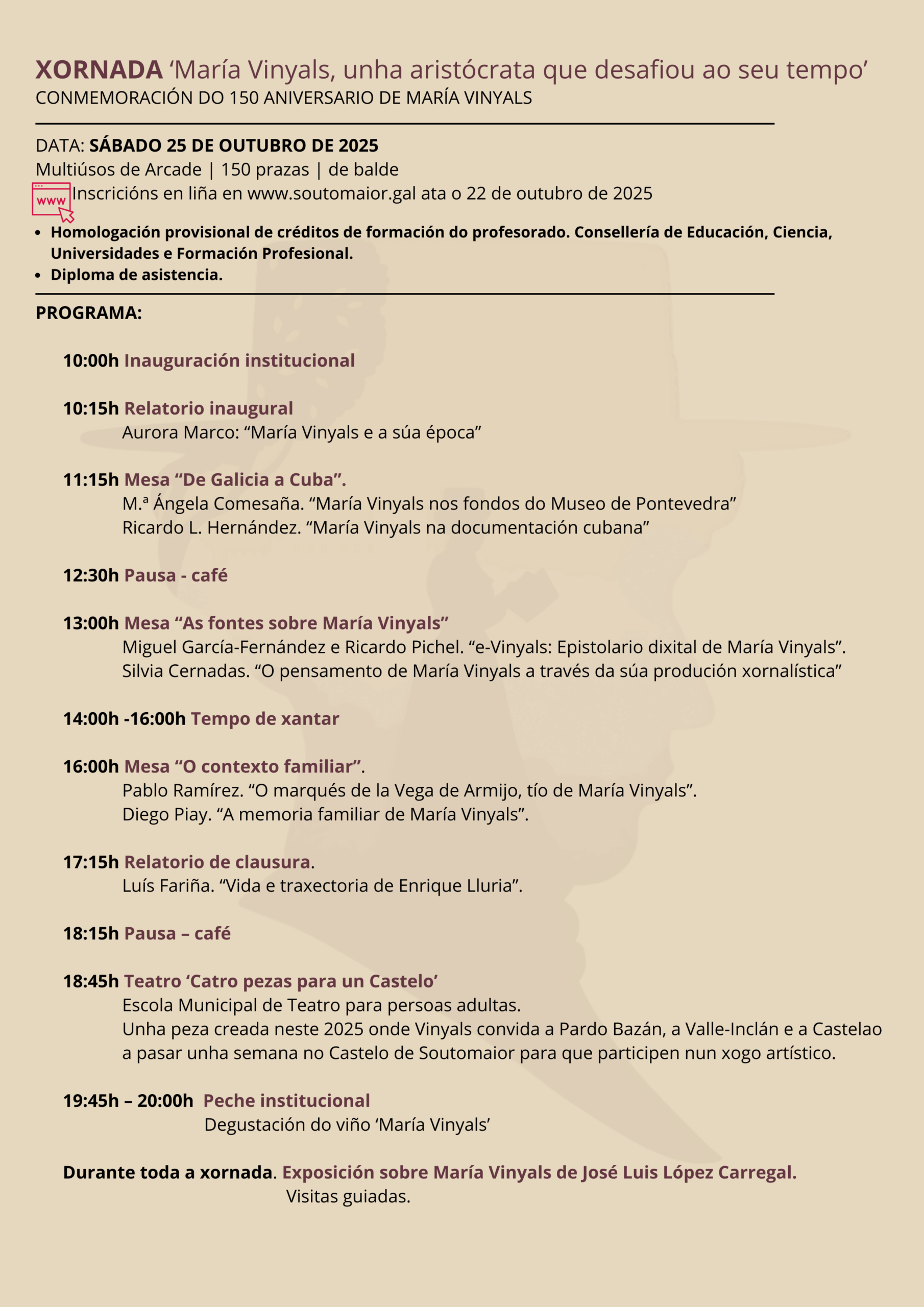 Soutomaior continúa cos actos de conmemoración dos 150 anos do nacemento de María Vinyals, unha das súas veciñas máis ilustres, escritora, feminista, pintora e xornalista, nacida o 14 de agosto de 1875 no castelo de Soutomaior. Co obxectivo de difundir a vida e a obra de Vinyals, coñecida como ‘Marquesa Vermella’ polo seu activismo social, a Concellería de Cultura ten previsto toda unha serie de actividades que comezaron o pasado 14 de agosto e que se van desenvolver ata o próximo 14 de agosto de 2026. O congreso internacional do próximo 25 de outubro será o acto central deste programa.