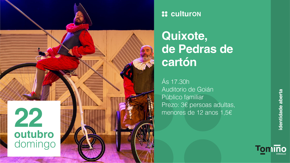 Tomiño continúa coa súa programación cultural, unha oferta de actividades de calidade para pequenos, pequenas e maiores e que esta fin de semana cede o escenario a un dos clásicos da literatura. Este domingo 23 de outubro a compañía Pedras de Cartón chegan ao auditorio municipal de Goián cos seu particular ‘Quixote’, un espectáculo para achegar os clásicos a toda a familia con humor, case sen palabras e cunha estética inspirada no pallaso clásico e moi próxima ao clown.