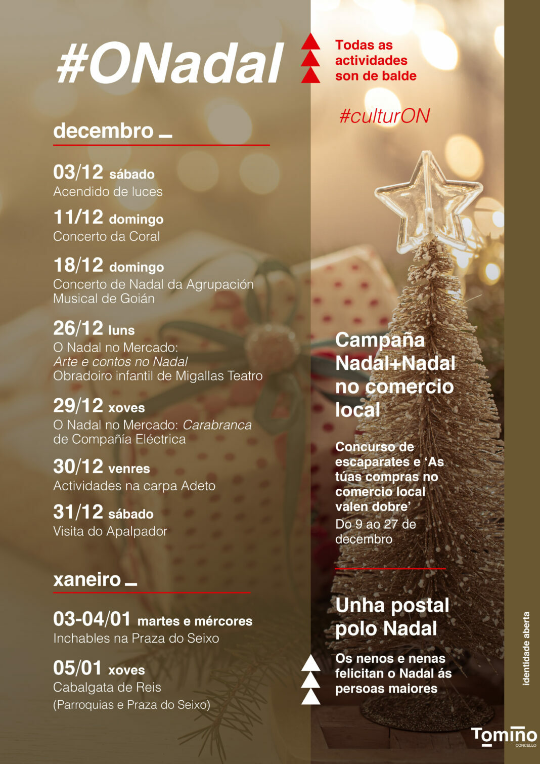 O pistoletazo de saída ao Nadal darase este mesmo sábado 3 de decembro co acendido das luces, que enchen Tomiño de cor a través de diferentes elementos decorativos que crearán un acolledor ambiente para estas datas. A partir de aí comezará un programa no que o público poderá escoitar o concerto da Coral Polifónica de Tomiño o domingo 11 de decembro (ás 19.00 h no auditorio municipal de Goián) e á Agrupación Musical de Goián no seu tradicional concerto de Nadal o día 18 (18 h, auditorio de Goián), no que participa boa parte do alumnado da Escola de Música, dende os máis pequenos do xardín musical ata a banda infantil e xuvenil.