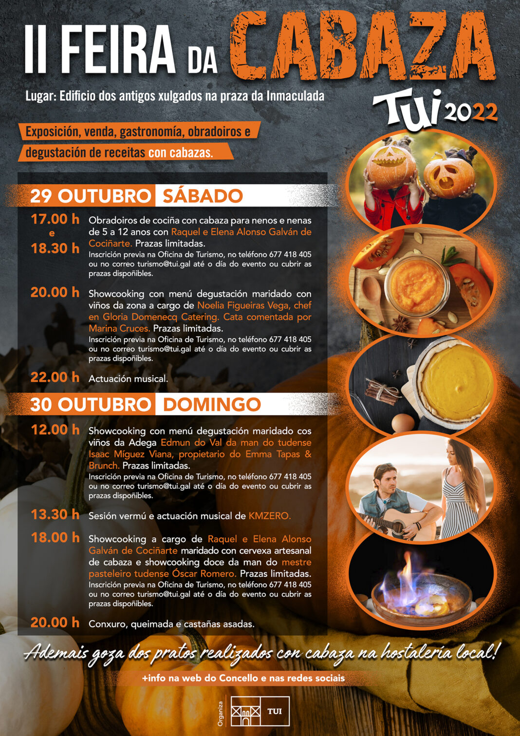 Para participar no obradoiro infantil de cociña e nos diferentes showcookings é preciso inscrición previa na Oficina de Turismo de Tui , co teléfono 677 41 84 05 ou no correo turismo@tui.gal, ata o día do evento ou ata cubrir prazas que son limitadas.