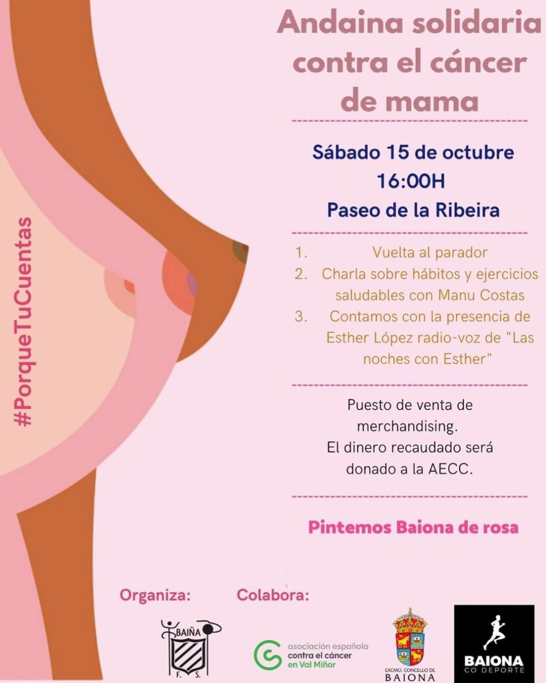 O Concello de Baiona, a través da Concellería de Deportes, e o Baíña F.S. en colaboración organizaron para mañá, 15 de outubro, unha Andaina Solidaria contra o Cancro de Mama. O municipio tinguirase de rosa cun roteiro ao redor do paseo de Monte Boi, un percorrido paralelo á Fortaleza de Montereal, o punto de encontro será o Paseo Ribeira. As persoas interesadas en sumarse soamente terán que presentarse neste lugar indicado. A partir das 16:00h haberá unha charla sobre hábitos e exercicios saudables con Manu Costas e tamén se contará coa presenza de Esther López de Radio Voz “As noites de Esther”. Tras a exposición darase inicio á andaina.
