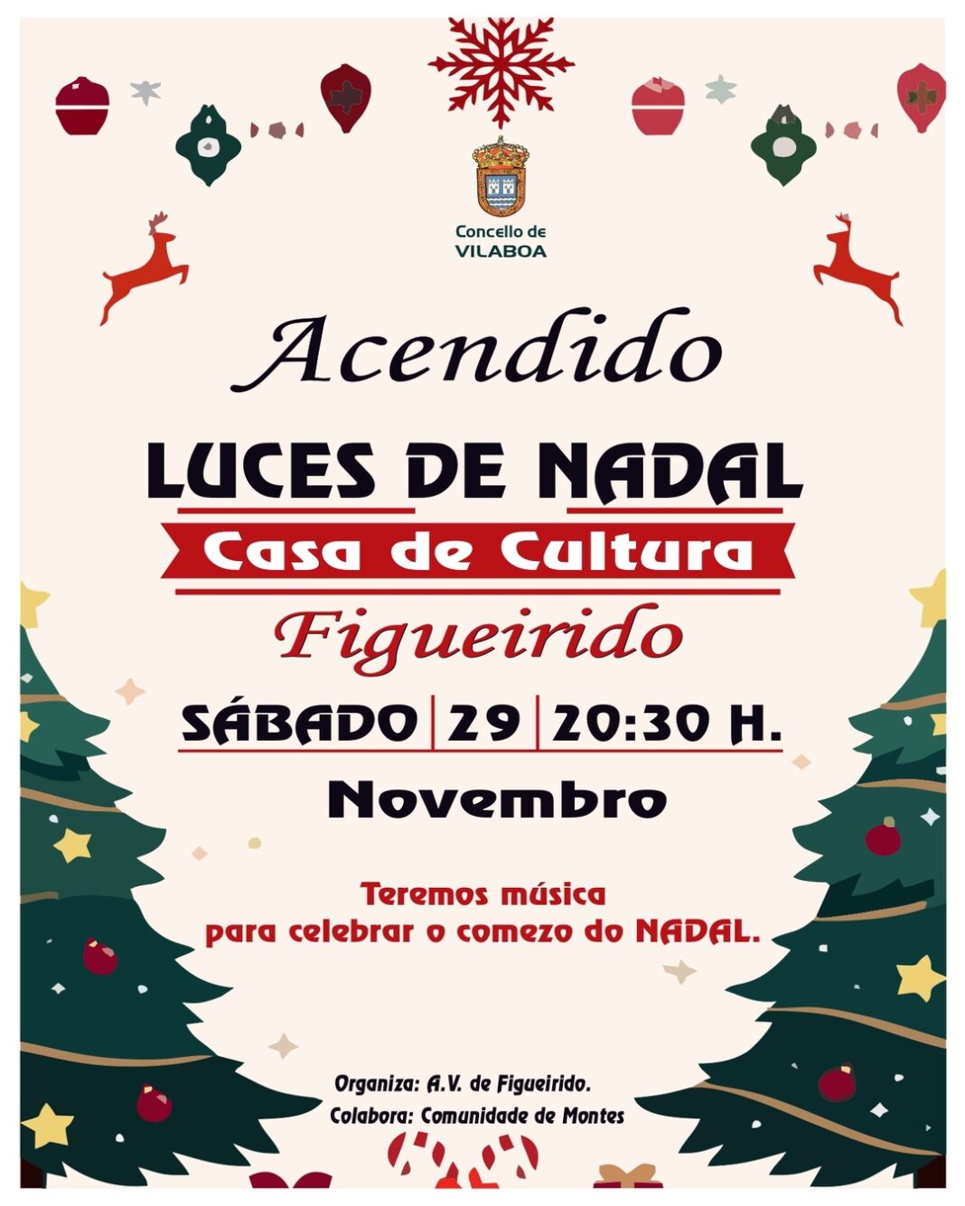 A parroquia de Figueirido será este sábado, a partir das 20:30 horas, o escenario do acendido da súa composición de Nadal, resultado dun intenso traballo veciñal que se prolonga desde o mes de setembro e que contou coa implicación directa de arredor de trinta persoas coordinadas pola asociación de veciños presidida por Raquel Peón.