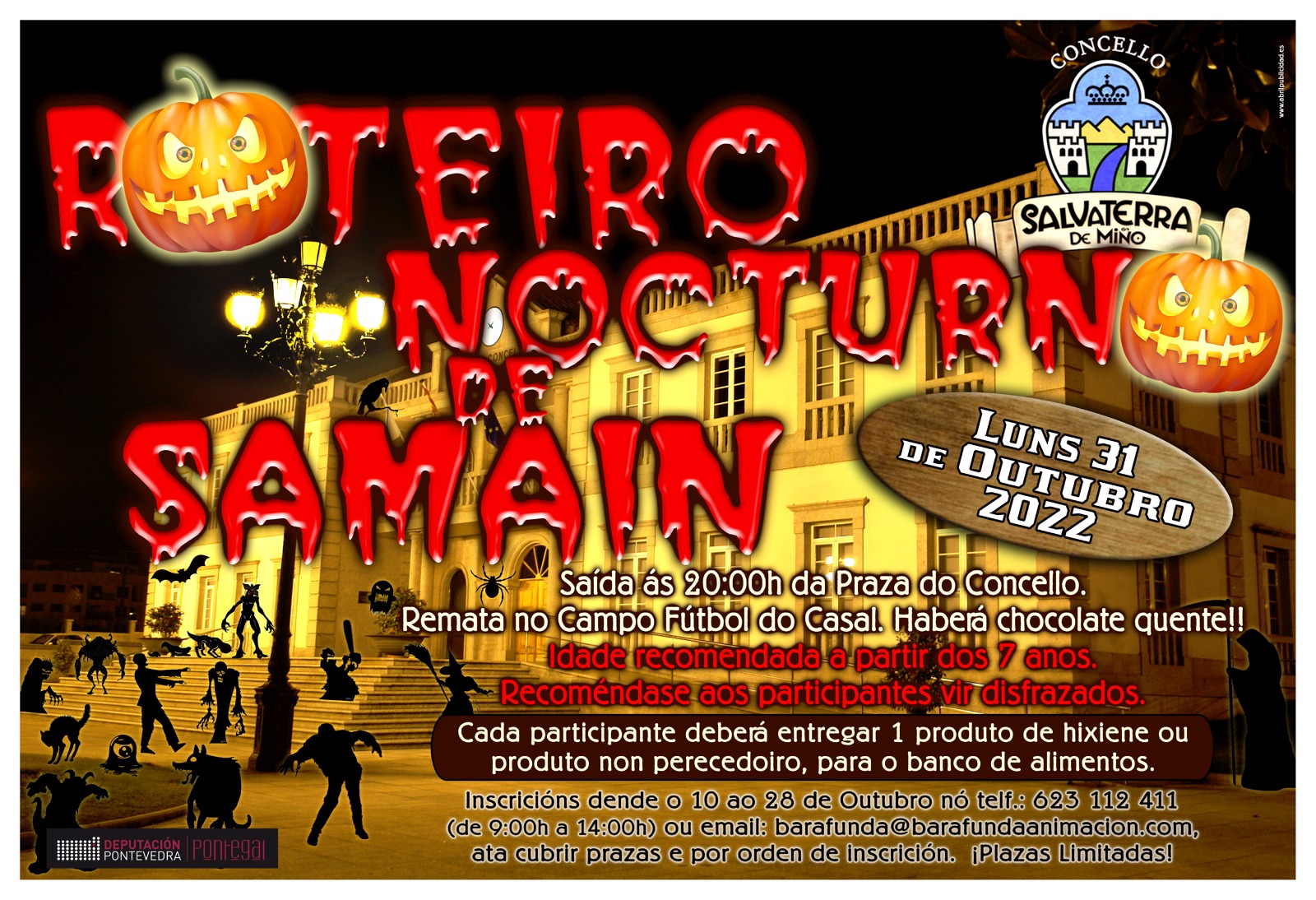 O vindeiro luns 31 de outubro terá lugar o tradicional roteiro de samaín, para que @s nen@s e adultos de Salvaterra vivan unha experiencia terrorífica ao mesmo tempo que divertida.