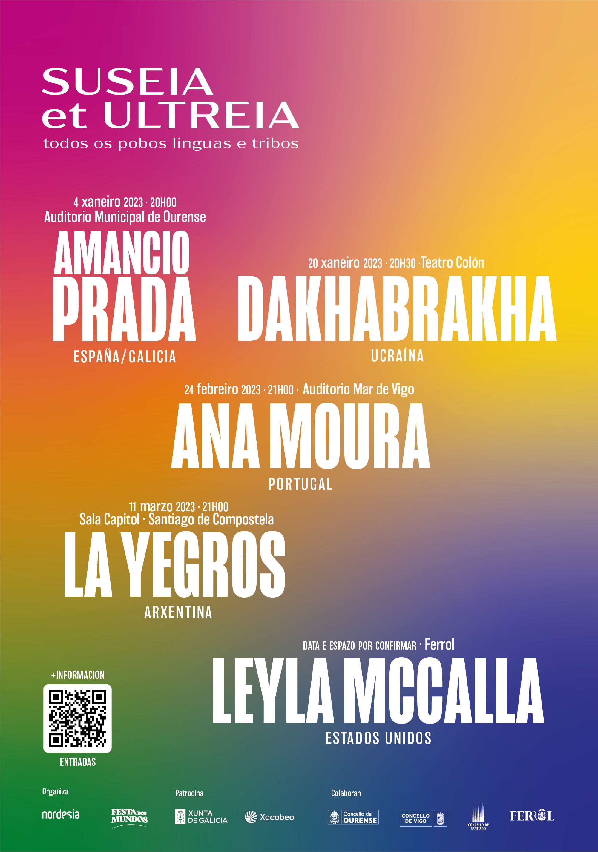 Os artistas que actuarán neste ciclo serán o español Amancio Prada, a portuguesa Ana Moura, a arxentina La Yegros, a estadounidense Leyla McCalla e a banda ucraína Dakhabrakha.