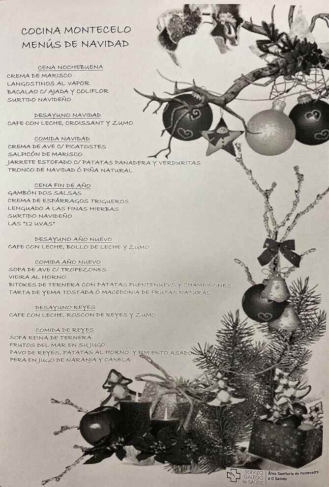 Os servizos de Hostalería do Hospital do Salnés en Vilagarcía de Arousa, así coma os do Provincial e Montecelo en Pontevedra, teñen listos para as vindeiras datas os menús para a celebración do Nadal, tempo no que, con adicación e traballo de equipo, prepararán pratos especiais tanto para os profesionais de garda dos centros hospitalarios da área coma para aqueles cidadáns que teñan que pasar o vindeiro tempo navideño ingresados durante a Noiteboa, o Nadal, a Noitevella, o Aninovo e o día de Reis.